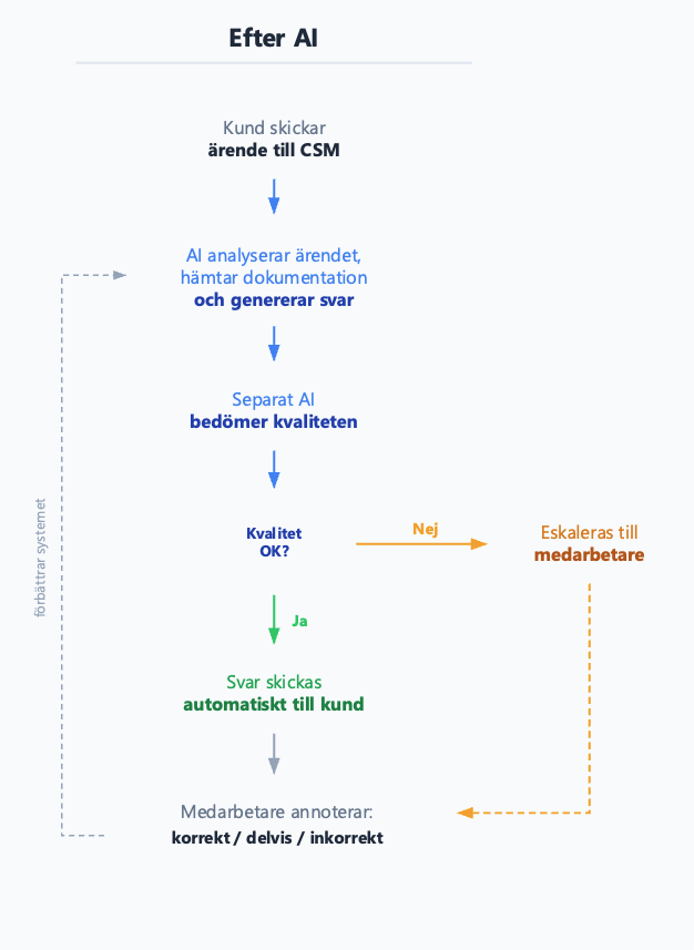 Vi byggde sedan ett fullfjädrat system, sömlöst integrerat i kundens CSM, som automatiskt genererar svar direkt till kunden. Det här är ingen chatbot som sitter vid sidan av och väntar på att någon ska ställa en fråga, utan AI:ntriggas automatiskt när ett nytt ärende kommer in, analyserar innehållet och svarar kunden i samma flöde som supportmedarbetarna jobbar i. En separat AI bedömer varje svar innan det skickas. Ett AI-svar som låter säkert men är fel är värre än inget svar alls, det urholkar förtroendet och skapar merarbete för supportteamet. Håller svaret inte tillräckligt hög kvalitet eskaleras ärendet till en människa.